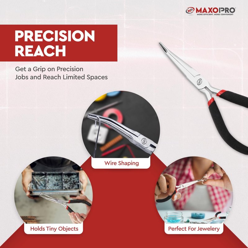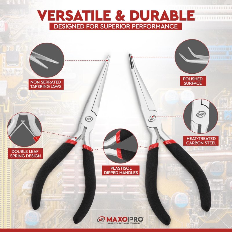 MAXOPRO MINI NEEDLE NOSE PLIERS SET Introducing our powerful duo - the Needle-Nose Pliers and Curved Needle Nose Pliers set! Crafted for precision and durability, these pliers are made from heavy-duty nickel-plated carbon steel, ensuring lasting performance and corrosion resistance. KEY FEATURES & BENEFITS Flexible Reach and Access: The long reach and angled nose design allow you to reach confined spaces and manipulate small objects easily. mini needle nose pliersened Cutting Edges: Perfectly aligned and sharp edges for precise and easy cutting. Rust-Resistant Durability: Constructed with heavy-duty nickel-plated carbon steel, ensuring long-lasting performance and resistance to corrosion and rust. Versatility in Confined Spaces: Access hard-to-reach areas and perform delicate tasks effortlessly with the pliers' long reach and angled nose design. Optimized Work Efficiency: Save energy and time with the high-leverage design, designed to maximize gripping strength and reduce fatigue during extended use. Guaranteed Satisfaction: The pliers set come with customer support and a lifetime guarantee, providing confidence in the quality and performance of the product. PRODUCT SPECIFICATION Material: Nickel-plated Carbon Steel Size: 6 Inches Pliers Details: (1) Long Nose plier (2) Curved Nose Plier (45 Degree Angle)