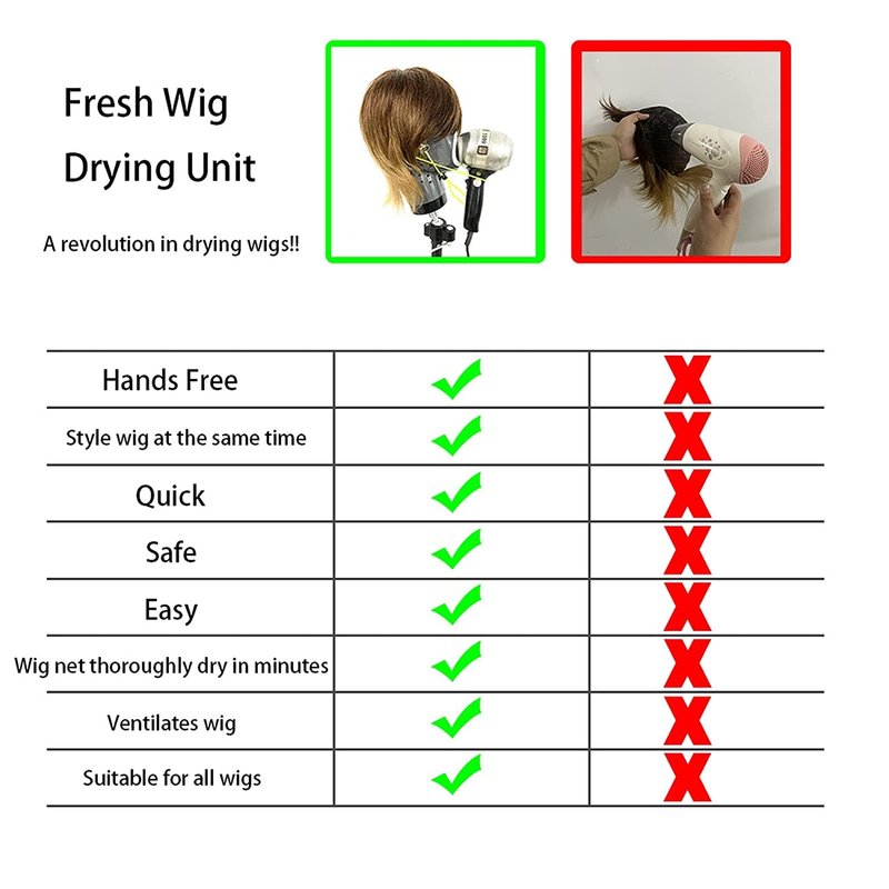 - Safty dryed natural hair and synthetic wigs. Prolong the life of your wig and keep it feeling and smelling clean and fresh - Wigs are expensive and so you must treat them with care. The Fresh Wigs Drying Unit causes no damage to your wigs when drying. Wash and dry your wig and handsfree - allows you to style the wig at the same time as drying.