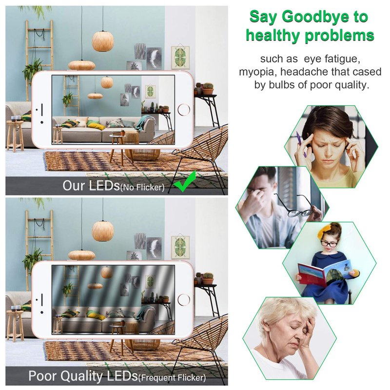 - No Flicker & No Strobe: The latest advanced LED technology eliminates the flicker from our A19 100 watt light bulb, reducing the suffering of some health issues such as eye exhaustion, migraine, and so on, which some certain levels of exposure to flickering lights could cause.