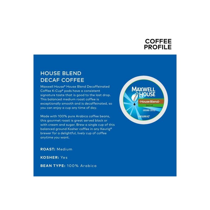 Sit back and enjoy Maxwell House House Blend Decaf Coffee K-Cup Packs at any time. It has a blend of 100 percent Arabica beans that produces a delicious flavor. Made into single-serve units, Maxwell House coffee K-Cup packs deliver a rich, full and smooth taste.