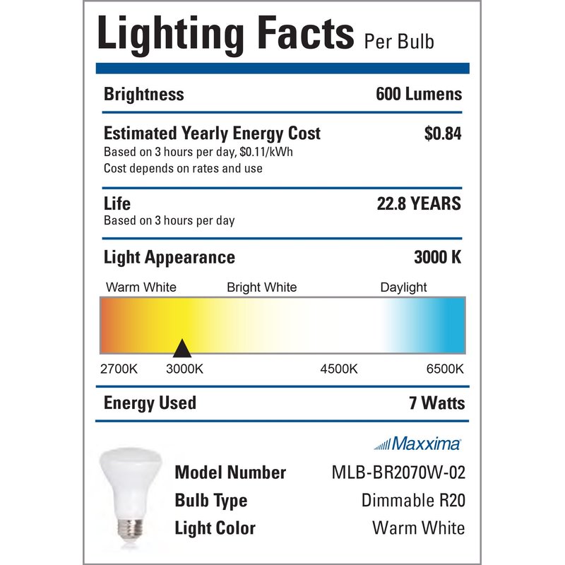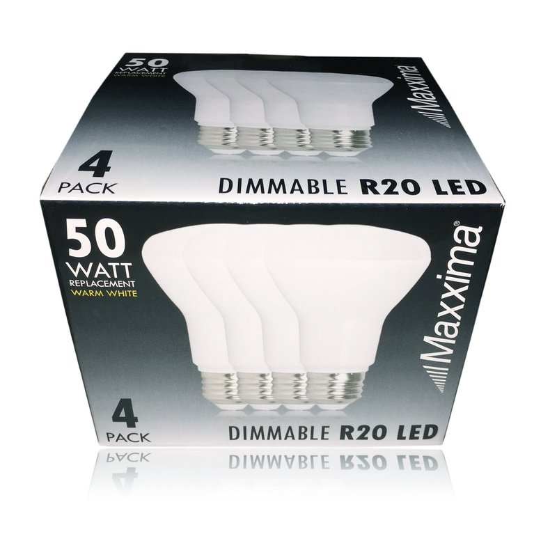 This warm white dimmable R20 BR20 LED light bulb gives off 600 Lumens and only consumes 7 Watts of energy compared to 50 Watt incandescent light bulbs. This is perfect for track or recessed applications throughout any residential or commercial building. This recessed light bulb has an E26 base allowing you to easily screw it into most standard sockets. This 4-pack of light bulbs is suited for kitchens, living rooms, bedrooms, offices, basements and more. They have 25,000 lifetime hours, are UL listed and are backed by Maxxima for 3 years.
