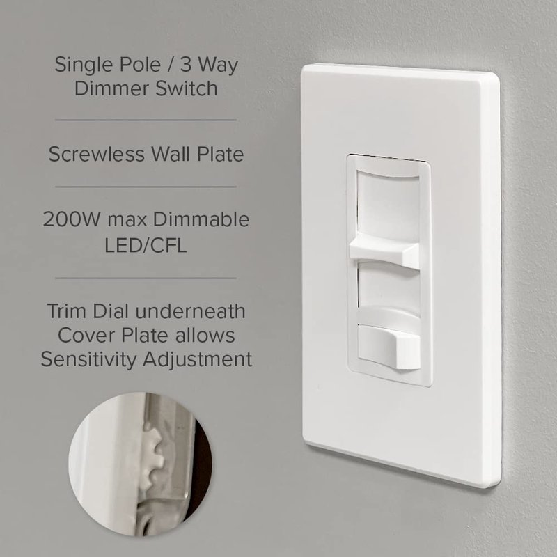 This 3-way dimmer switch from Maxxima features a vertical slide dimmer control, providing smooth performance in dimming your LED light bulbs. Working with up to 200-watts of dimmable LED/CFL light bulbs or 600-watts of incandescent/halogen light bulbs allowing you to control multiple bulb types. This dimmer switch is also equipped with an independent on off switch. This Maxxima dimmer conveys a smooth, luxurious look thanks to the included white decorative screwless wall plate, and plate mount. Its quick and easy installation allow you to provide a clean, seamless look to any room. Featuring a trim dial that can be adjusted during installation to set the minimum brightness level, this dimmer light switch also comes with a 1-year manufacturer warranty and is ETL Listed.