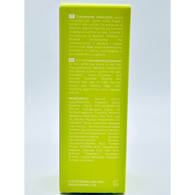 No rinse strengthening treatment for fine, brittle hair prone to hair loss. The presence of menthol, peppermint and banana extract purifies the skin, stimulates micro-circulation and provides essential vitamins and minerals that help to make the hair strong and healthy. Use : after cleansing, apply to the roots, massage and dry.