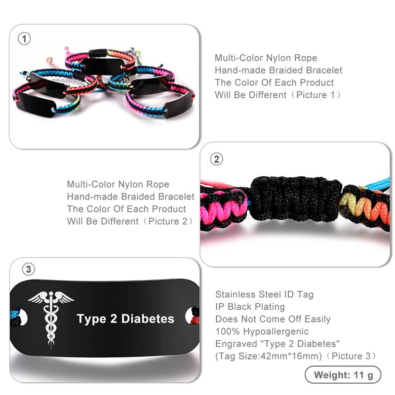 - 🌻 This personalized medical certification bracelet is elegantly designed. It is composed of a Stainless Steel Medical ID Tag and a Nylon Braided Rope. The bracelet is light and does not fade easily when exposed to water. It is suitable for travel, swimming and other places, daily wear, weddings, Christmas parties, dance parties or any occasions where you want to be more charming and get more praise.