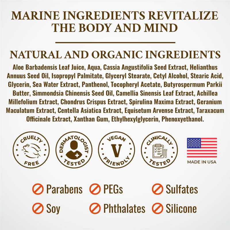 Contains botanical hyaluronic acid, jojoba oil, gotu cola, Irish moss, aloe vera, spirulina extract, ocean mineral sea water extract;