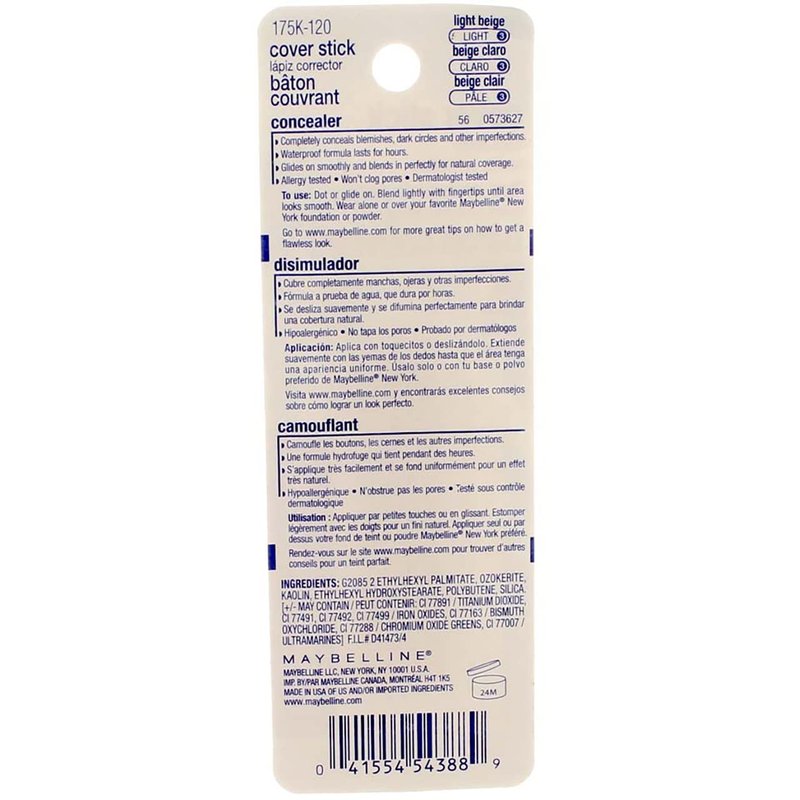 - Lightweight Concealer: The Maybelline Cover Stick Concealer provides lightweight coverage for under eye imperfections.