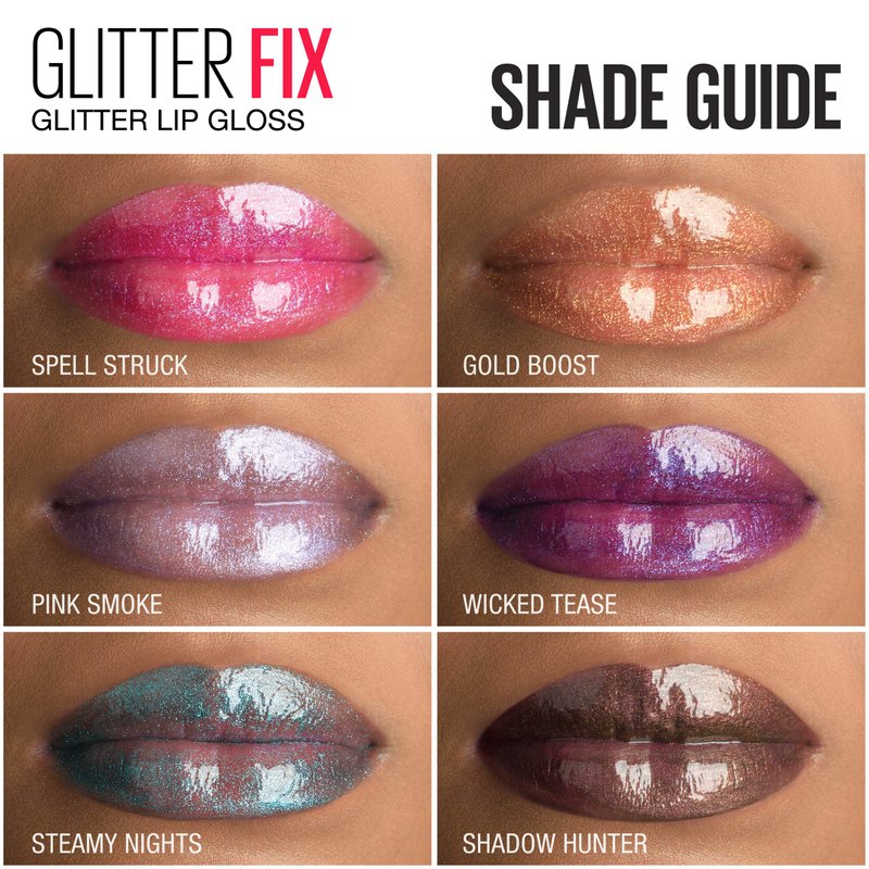 - From pink and blue to bronze, silver, and gold, Maybelline's Glitter Fix lip gloss is available in a collection of shimmering shades