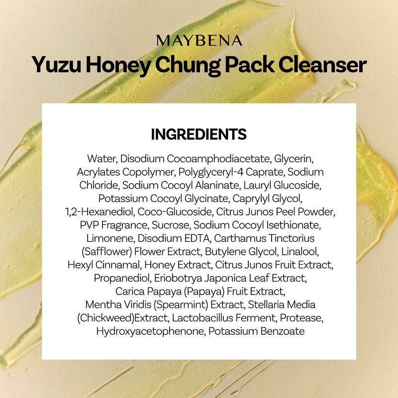 - PERFECT FOR ALL SKIN TYPES. Crafted with gentle, plant-derived ingredients, Maybena Yuzu Honey Chung Pack Foaming Cleanser is suitable for all skin types. Simply take an appropriate amount, lather up sufficiently, gently massage, and rinse with lukewarm water. Enjoy the nourishing effects with every use!