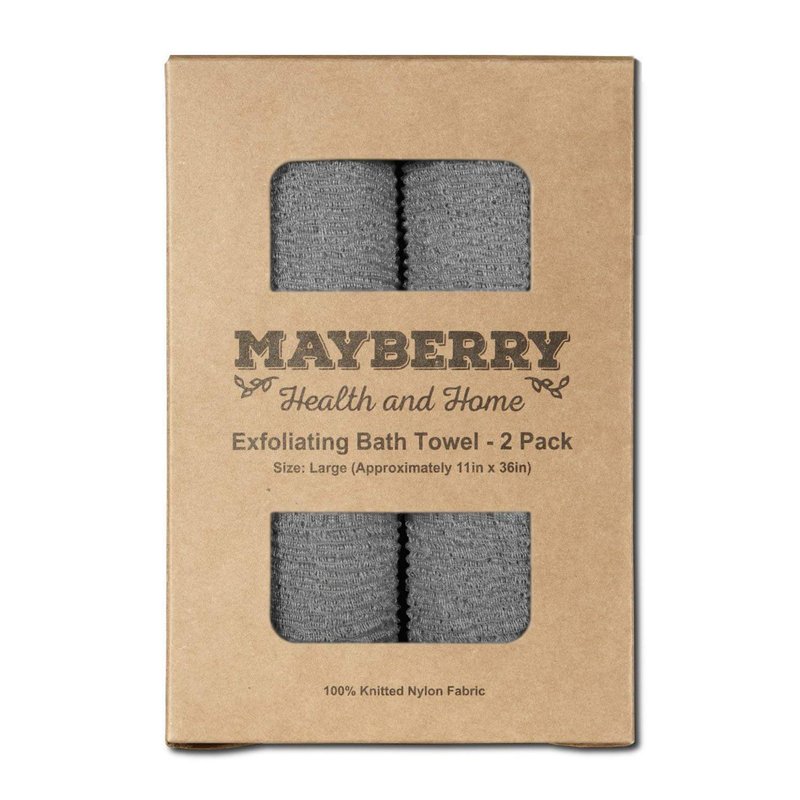 Mayberry Health and Home Extra Long (36 Inches) Exfoliating Bath Cloth (2 Pack) Gray Nylon Bath Towel, Stitching on All Sides for Added Durability