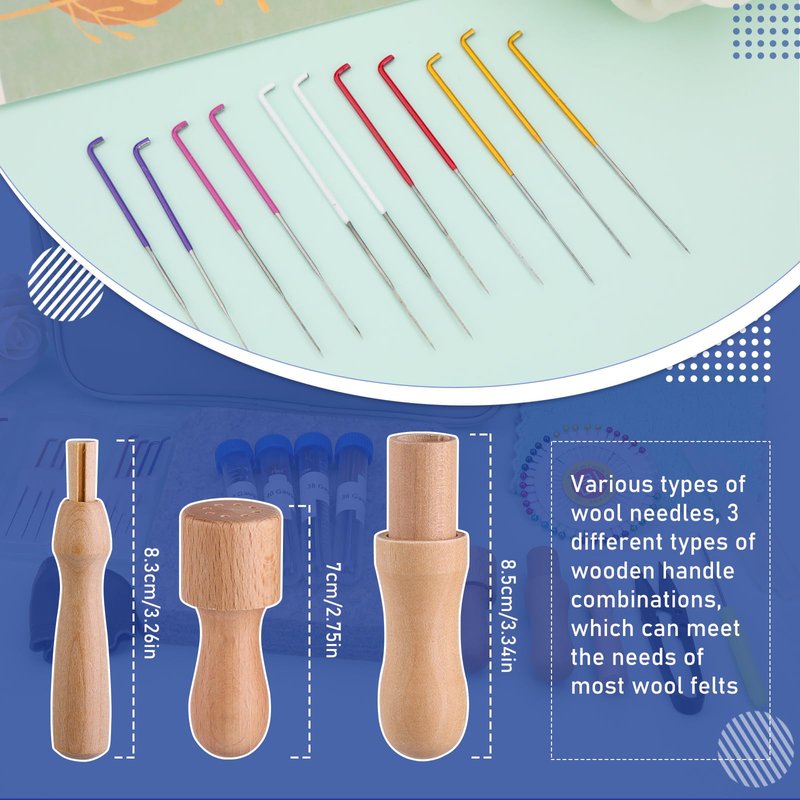 Practical Felt Tool Set: Contains a felt pad, 40 felt needles(10pcs 36gauge, 10pcs 38gauge, 15pcs 40gauge, 5pcs 40gauge), 3pcs star felting needles,4pcs cone felting needles,4pcs spiral felting needles,1 single needle handle,1 pair of finger cots, 1 rag (for oil on needles ), etc..a bag for all felting felting tools.
