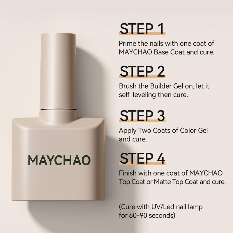 - Quick and easy application: Create classy manicures with MAYCHAO builder nail gel. Brush on, expand, sculpt nails as desired and cure for 60 seconds led or 2 minutes uv to keep it in place. Its light self-leveling properties assist in an effortless application on the nail. Once you attach all the nail extensions, proceed with polish and whatever designs you want. Easy peasy!