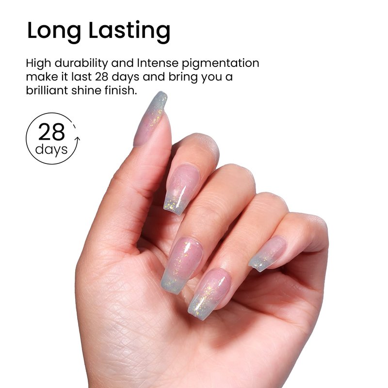 - Infinite Shine Long Wear: MAYCHAO gel nail polish will last up to about 28days or longer with proper nail prepare (filing, buffering, and cleaning ). More strong, more flexible, and simpler to manipulate than conventional nail polishes, giving your nails a lovely appearance.