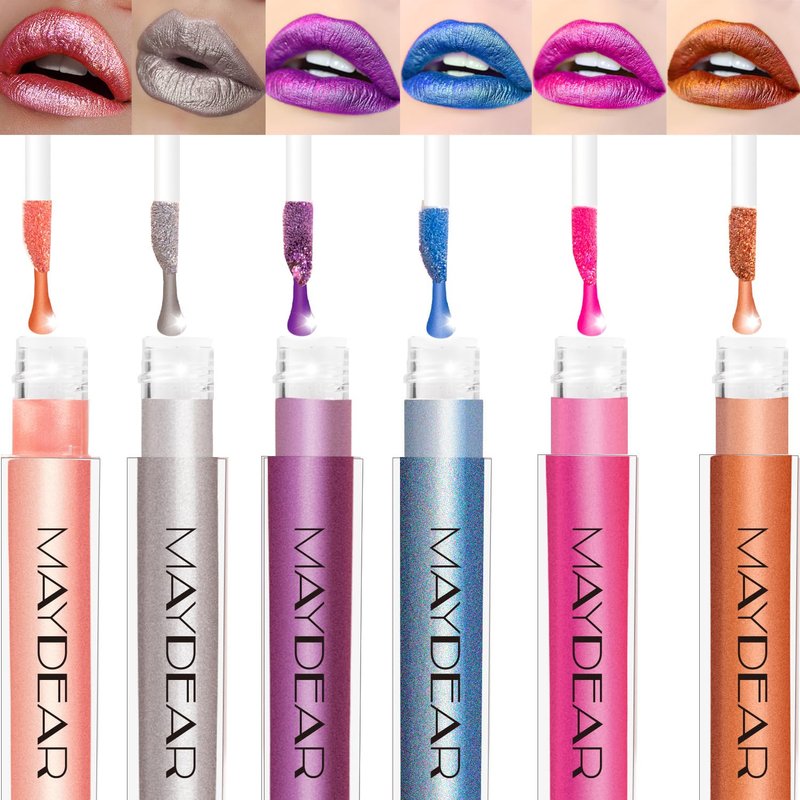 Maydear Metallic Liquid Lipstick, 6 Colors Shimmer Lip Gloss Set for Women, Long-Wear, Diamond Glitter Finish, Pearl Glam Lip Stain Makeup for Dress-Up, Cosplay, Halloween