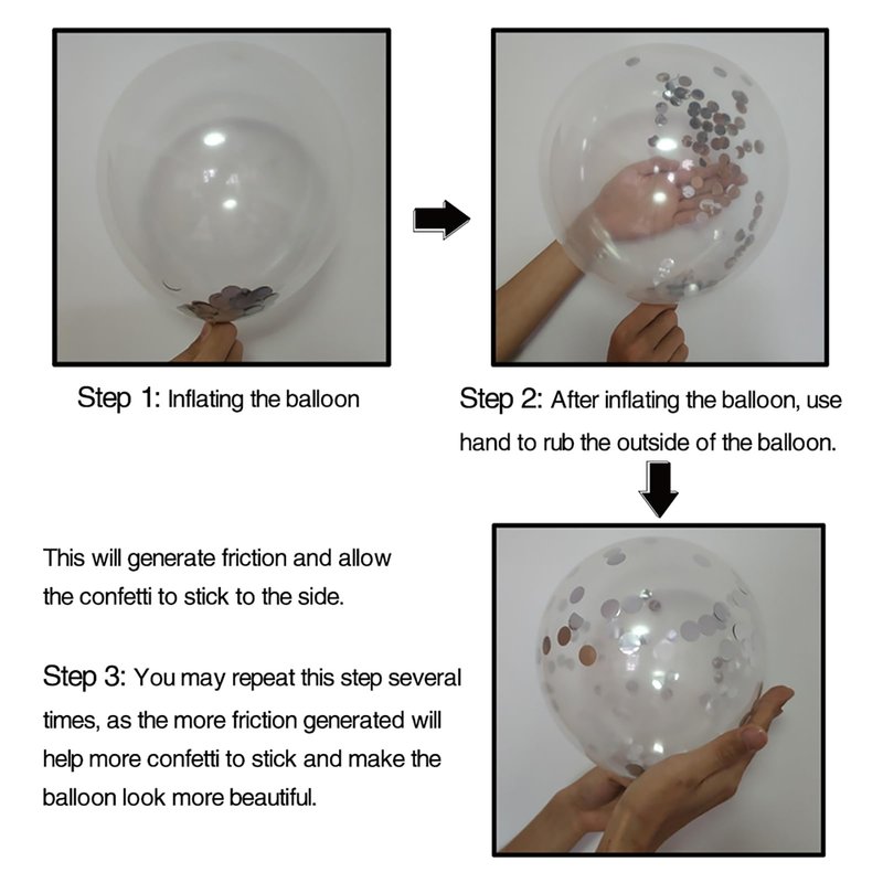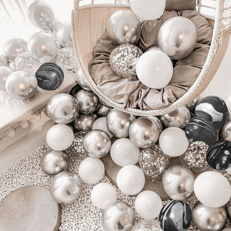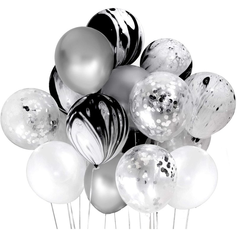 - Package Includes: 5 x 12 Inch Black Marble Balloons, 5 x 12 Inch Silver Confetti Balloons, 20 x 12 Inch Silver Chrome Latex Balloons, 20 x 12 Inch White Latex Balloons