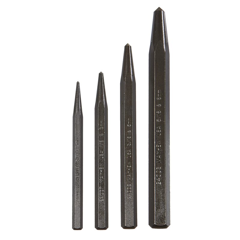 - Set includes 3/16-5mm x 5", 5/16-8mm x 6", 5/64-2mm x 4" & 1/8-3mm x 4-1/4" center punches
