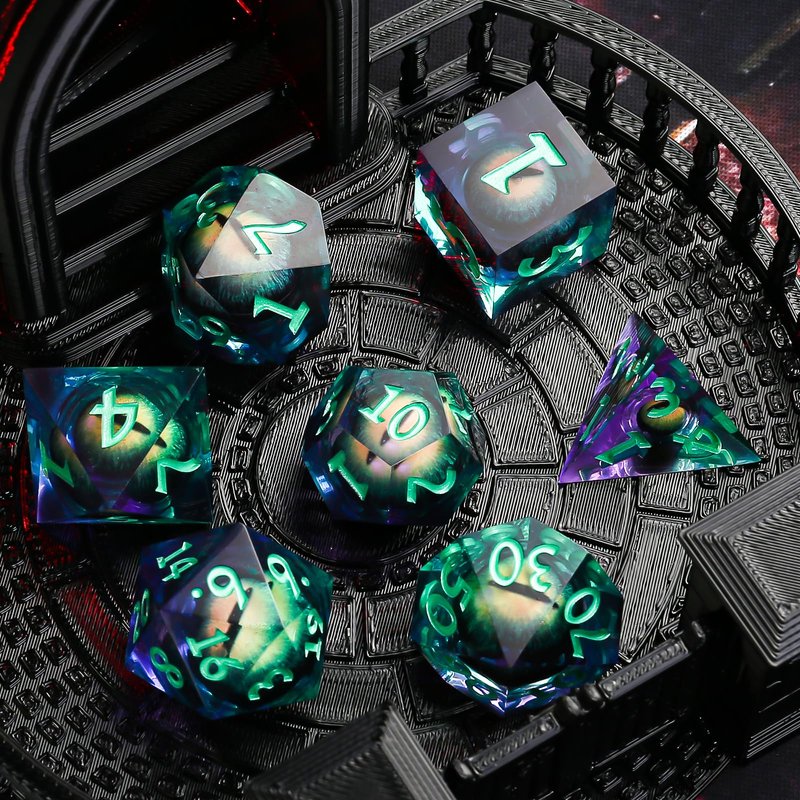 The 7 Piece Liquid Core Eye dice Set that is sturdy and durable, with a quality that will stand the test of time and will stand up to years of use.
