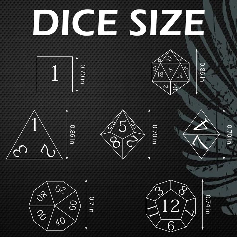 The 7 die dice set is perfect for Dungeons and Dragons, RPG, MTG, Shadowrun, Pathfinder, Yahtzee, math games, and other table games etc.