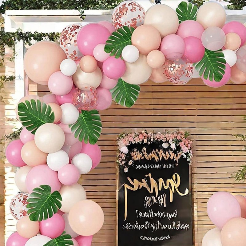 - [Tropical Balloon Arch]: This tropical-themed pink and yellow balloon garland includes: 12 white balloons, 8 orange balloons, 20 pink balloons, 21 soft pink balloons, 14 vintage yellow balloons, 8 light yellow balloons, 4 transparent balloons, 8 gold confetti balloons, 8 artificial leaves, 1 roll of decorative strip, 1 roll of balloon chain, 1 roll of balloon glue