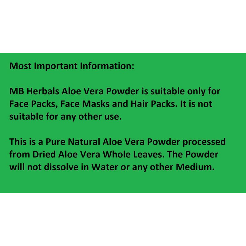 MB Herbals Aloe Vera Powder is FOR EXTERNAL USE ONLY. It is suitable for Face Packs and Hair Packs only.