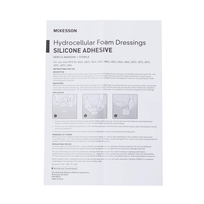 McKesson adhesive silicone foam dressing with border minimizes discomfort to individuals when it's time to remove the dressing. The outer film layer of the dressing resists moisture while remaining breathable.