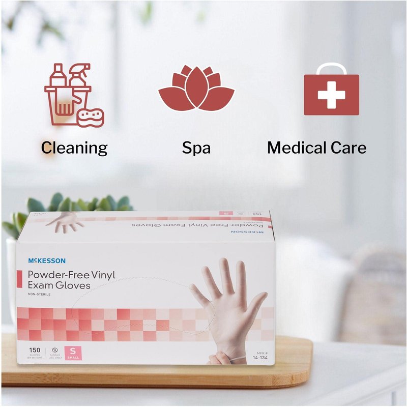 McKesson vinyl exam gloves' comfortable fit helps deliver high performance with a sterile, polymer coating. Powder-free, they help minimize the absorption and transport of irritants and allergens. Healthcare professionals can easily don the gloves in both damp and dry conditions.
