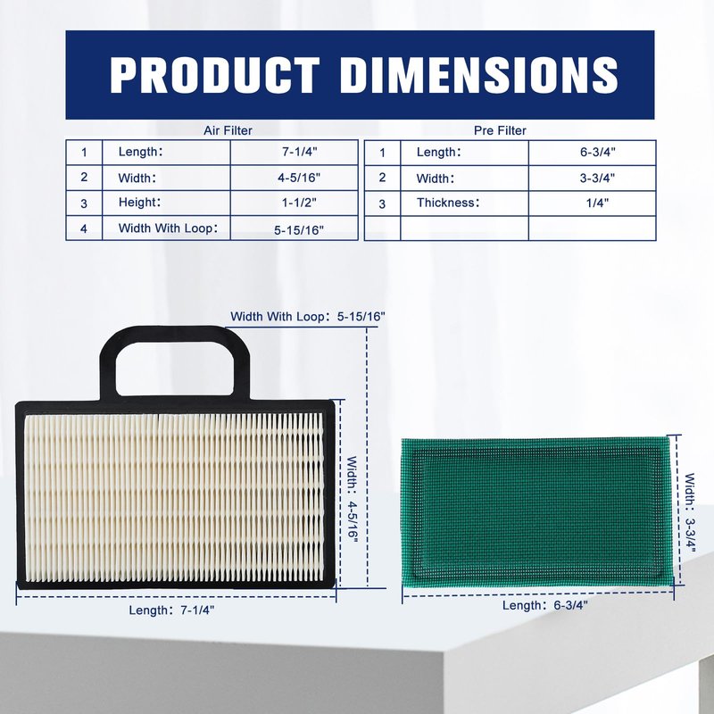 - [Air Filter Dimensions]: Length:7-1/4", Width:4-5/16", Height:1-1/2" , Width With Loop:5-15/16"