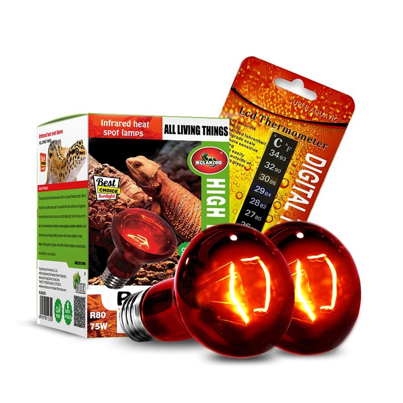 MCLANZOO Infrared Heat Lamp Bulbs 75W 2 Pack,Red Basking Spot Light Bulb Reptile Heating lamp for Bearded Dragon,Turtle,Snake,Leopard Gecko,Chicked with Digital Temperature Thermometer