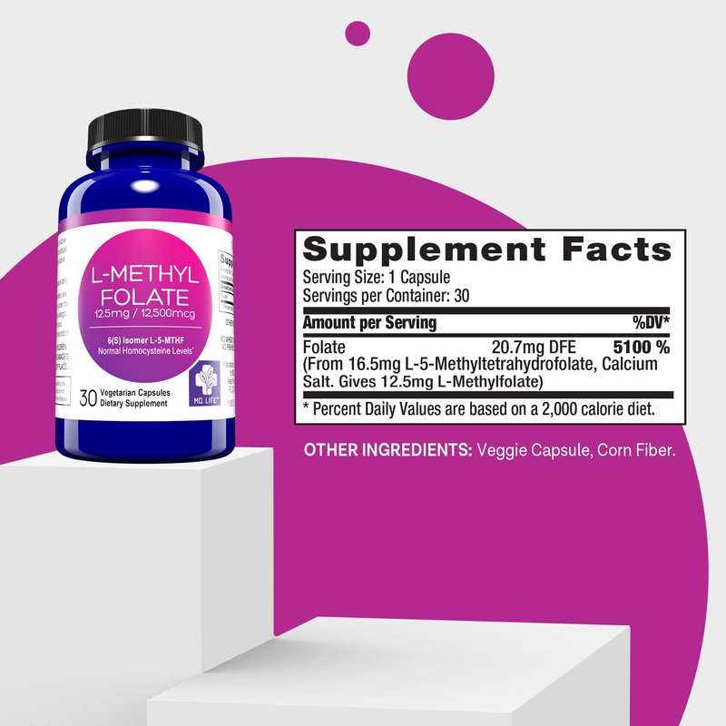 - TRUST IN QUALITY: MD. Life l methylfolate 12.5mg meticulously designed by experts and manufactured in small batches using superior ingredients. These folate supplements are proudly made in the USA in an FDA registered facility, adhering to GMP certification and undergoing rigorous third-party testing. Rest easy knowing that our products meet the highest standards of safety, quality, and performance.