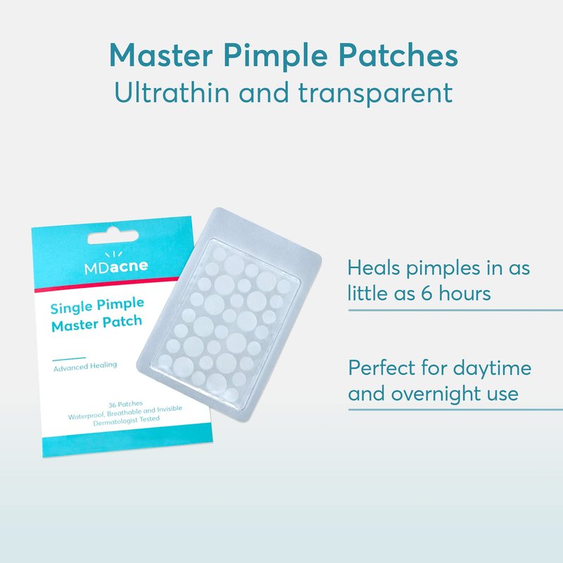 - MDacne MASTER PIMPLE PATCHES: Want to get rid of a pimple fast? The MDacne Master Pimple Patches help heal blemishes in as little as 6 hours! Transparent and ultrathin, they can be worn comfortably day or night to help get rid of pimples faster than ever! 36 total patches (12 large patches and 24 small patches).
