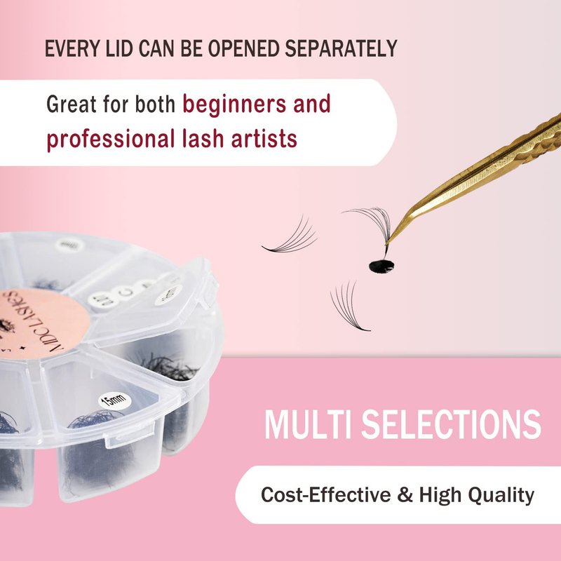 - 💟 [High-Quality Eyelash Fan ]: Volume fans produced by an eyelash extension supplier in advance. Our easy fan lash extensions are made of 100% PBT material which is soft, very dark, and ready to be dipped and placed on your lash. Short Stem in 5D 6D 7D 8D 9D 10D with C/D curl in 0.05-0.07 thickness, length from 9-16mm.