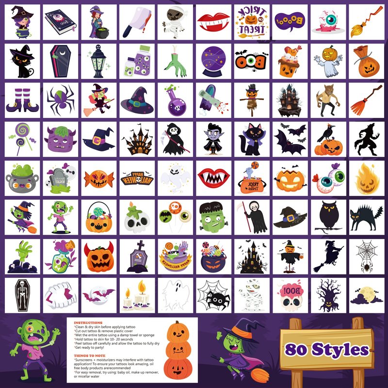 - Kids' Halloween Delight: Let your little ones immerse themselves in the Halloween spirit with adorably spooky Halloween tattoos for kids. Watch their faces light up as they proudly show off their favorite Halloween characters and designs.Halloween decorations