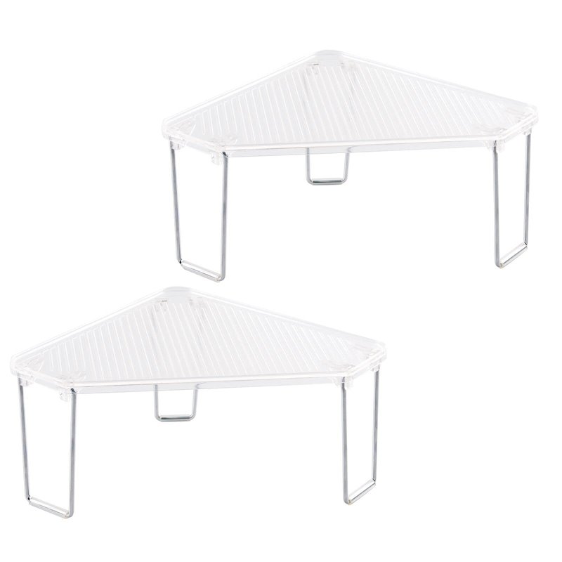 - COMPACT DESIGN: Corner design is ideal for smaller spaces; Non-slip feet keep the storage shelf from slipping, especially when stacked while also protecting your counter surfaces from scratches; Fold the shelf flat for space-saving storage when not in use; Perfect for apartments, condos, dorm rooms, RVs, cabins, campers and cabins
