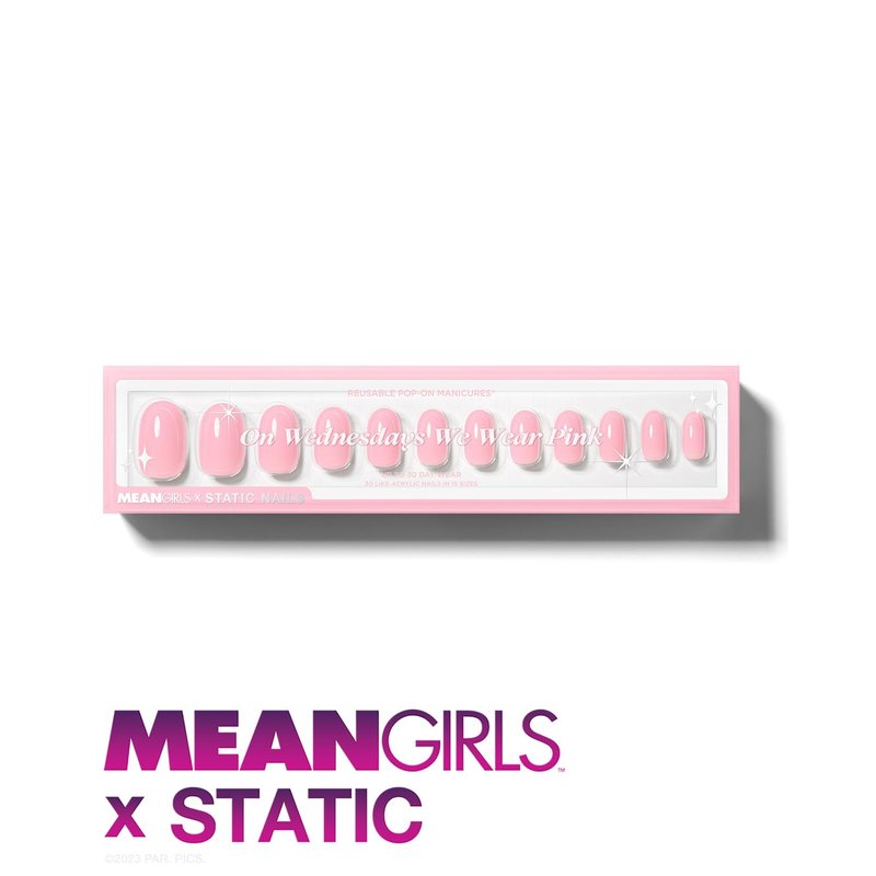 MEAN GIRLS X STATIC LIKE-ACRYLICS Seriously, these limited-edition MEAN GIRLS x STATIC Reusable Pop-On-Manicures are SO fetch! They'll give you a perfect, non-damaging mani in minutes. Plus, each nail is totally bend and crack-resistant and lasts up to 30 days. Wear them weeks straight or a few days at a time - you decide.