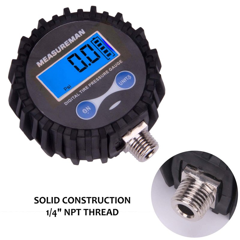MEASUREMAN 2-1/2" Dial Size Digital Air Pressure Gauge with 1/4'' NPT Bottom Connector and Protective Boot, 0-200psi, Accuracy 1%, Battery Powered with LED Light