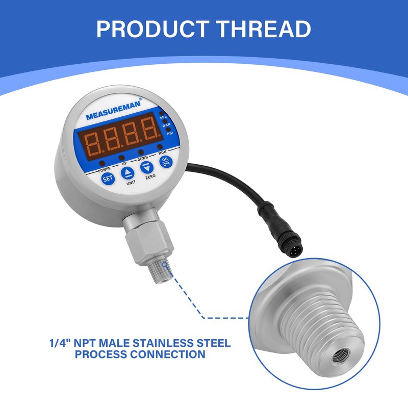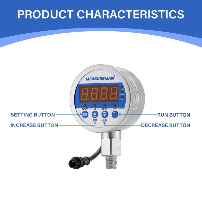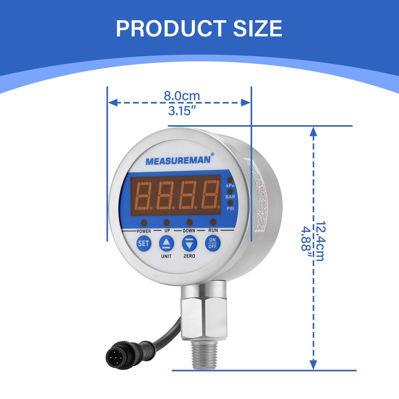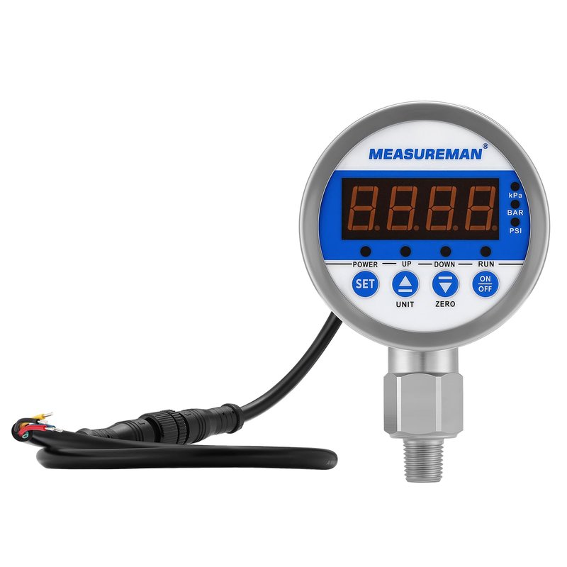 MEASUREMAN 3-1/8" Dial Size Stainless Steel Industrial Digital Pressure Control, Pressure Switch, 1/4" NPT Lower Mount, -15-0psi Vacuum, 110VAC, 0.5% Accuracy, LED Display