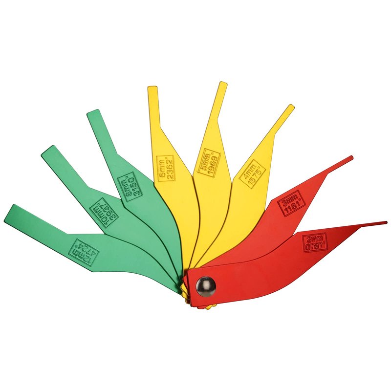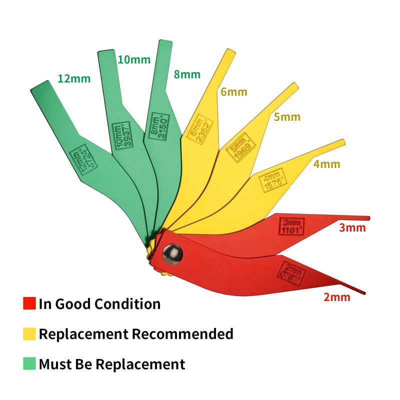 - Blade Sizes:This Brake Gauge Tool Set includes eight brake,each gauge blade has both Metric & SAE,Three green (0.4724, 0.3937, 0.3150 inch & 12, 10, 8 mm ), Three yellow (0.2362, 0.1969, 0.1575 inch & 6, 5, 4 mm ), and Two red (0.1181, 0.0787 inch & 3, 2 mm).