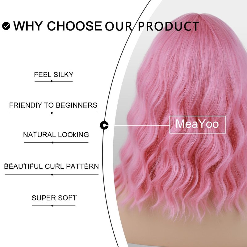 MeaYOO Pink Wig Short Wavy Wigs for Women Synthetic Wig Pink Wig for White Women Short Pink Curly Wig for Black Women pelucas de mujer Cosplay Wigs Specification: Pink Wig Material: High-quality synthetic material Wigs for White Women Length: 14 inches Wigs with Lace Texture:This fiber is resistant to high temperatures up to 150°C, but we strongly advise against using heating tools directly on it. Cosplay Wig Weight:180g Hairstyle: short bob wavy Wigs Hair Color: Pink Bob Wig Pink Wig Cap: Cap Circumference 21.5”-22.5” Short Wig Occasions: Daily use, Wear at home,Travel, Dinner with friends, Go shopping, Cosplay, Wedding, Travel & etc Pink wig pelucas de mujer pelo humano Short Wigs for Women pink Wig Cosplay wig Wavy bob wig human hair Cheap Wigs Womens Wigs Short wigs human hair