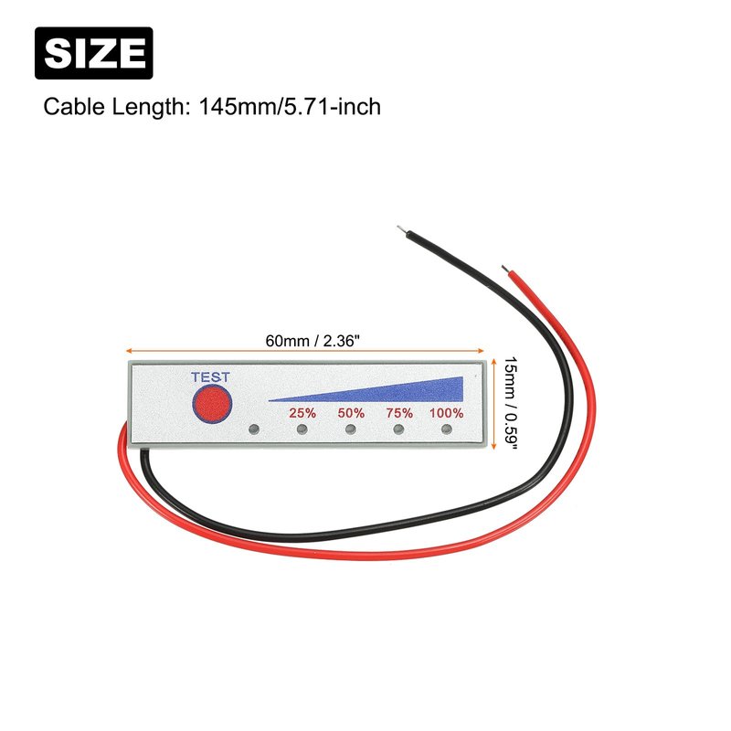 - Working Voltage: 11.1-12.6V; Board Size: 60x15x3mm/2.36x0.59x0.12-inch (L*W*H); Cable Length: 145mm/5.71-inch; Backlight Color: Red/Blue; Type: Battery Indicator; In the package of: 3pcs x Battery Meter