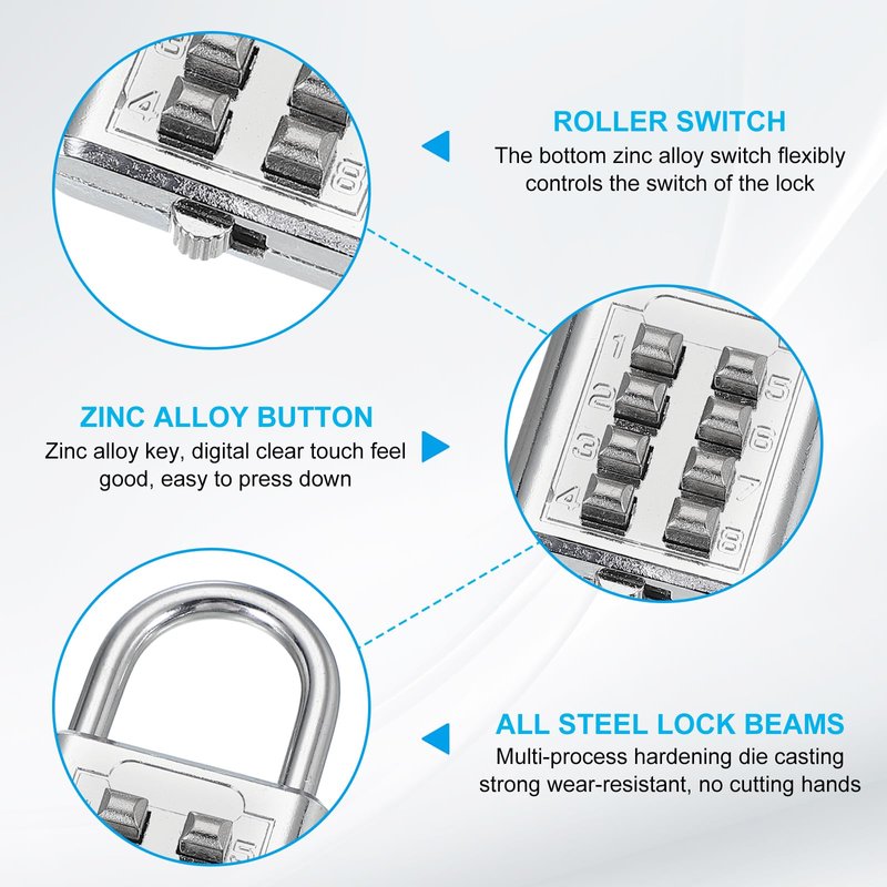 - 8-Digit Combination Padlock with a Push Button Lock offers keyless security solution for your valuables. Suitable for securing lockers, cabinets, luggage, gym, fence, toolbox, and more with ease and efficiency