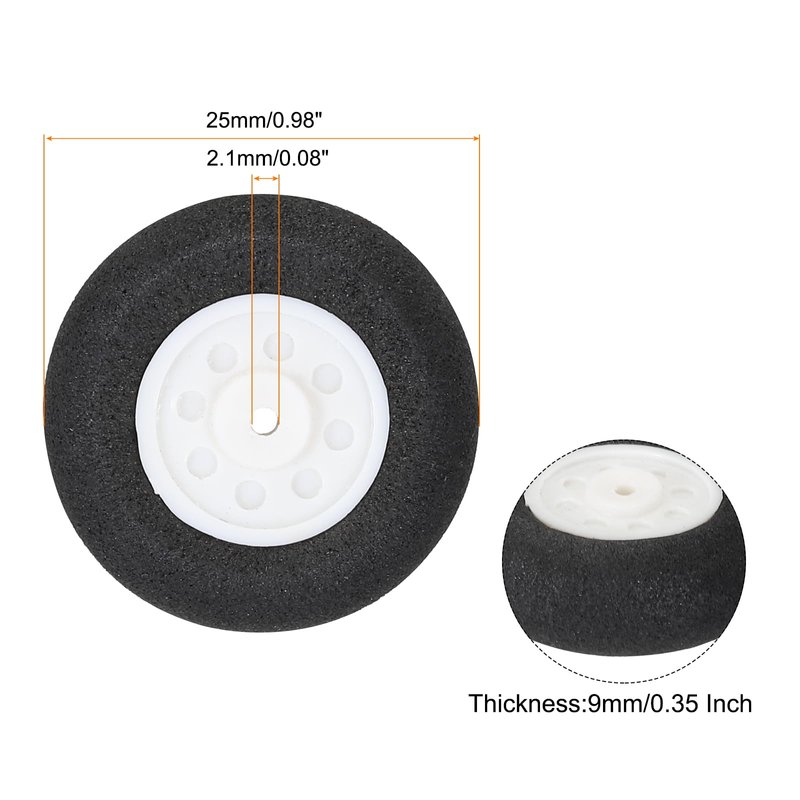 - RC Model Plane Aircraft Wheel,is in size of:Outside Diameter:25mm/0.98 Inch;Thickness:9mm/0.35 Inch;Axle Hole Diameter:2.1mm/0.08 Inch;Color:Black,White;Material: Sponge,Plastic;In the package of: 10 x RC Airplane Aircraft Sponge Wheels;