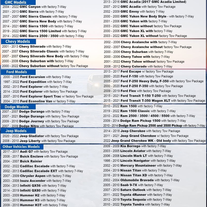 This dual-output trailer adapter simply replaces the 7-Way USCAR connector that came with your vehicle, it features both 4 Pin and 7 Pin connector in case you have multiple trailers with different connectors, adding versatile towing options. Both 7 way rv connector and 4 way flat socket comes with rubber dust covers. fitment: 2002-2006 Chevrolet Avalanche 1500