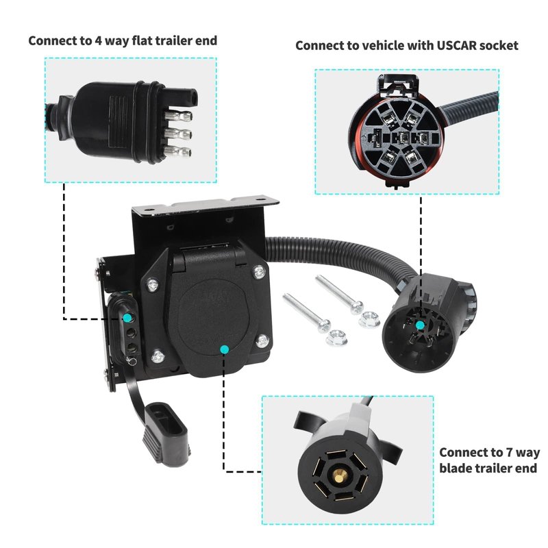 - 【Multi-Plug 7 & 4 Connector】 Dual-output 4 pin and 7 pin trailer wiring adapter makes it easy to tow different trailers with your vehicle, for used to convert standard USCAR 7 way socket at your truck end to a combination 7 pin and 4 pin trailer connector outlets.