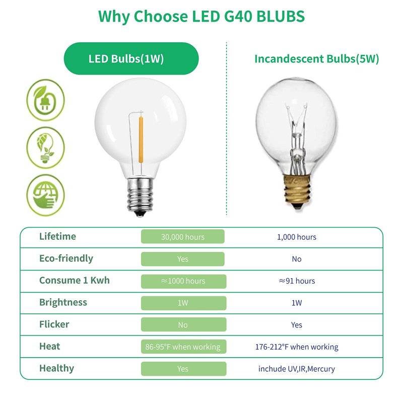 - E12 Base and Wide Aplication: LED vintage G40 light bulbs with candelabra screw base that fits e12 and c7 based sockets, not only the excellent decorative lighting for indoor chandeliers, sconces and fixtures where the bulb is visible, but also the best replacement bulbs for LED G40 outdoor string lights in your garden, backyard and balcony terrace.