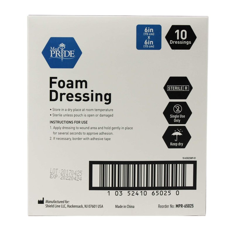 MED PRIDE Foam Dressings -10 Pack, 6'' x 6'' - Sterile, Hydrophilic, Highly Absorbent- Soft, Non-Adhesive Pads, Waterproof Dressing for Wound Care & Ulcers, Post Op Trauma + Injuries