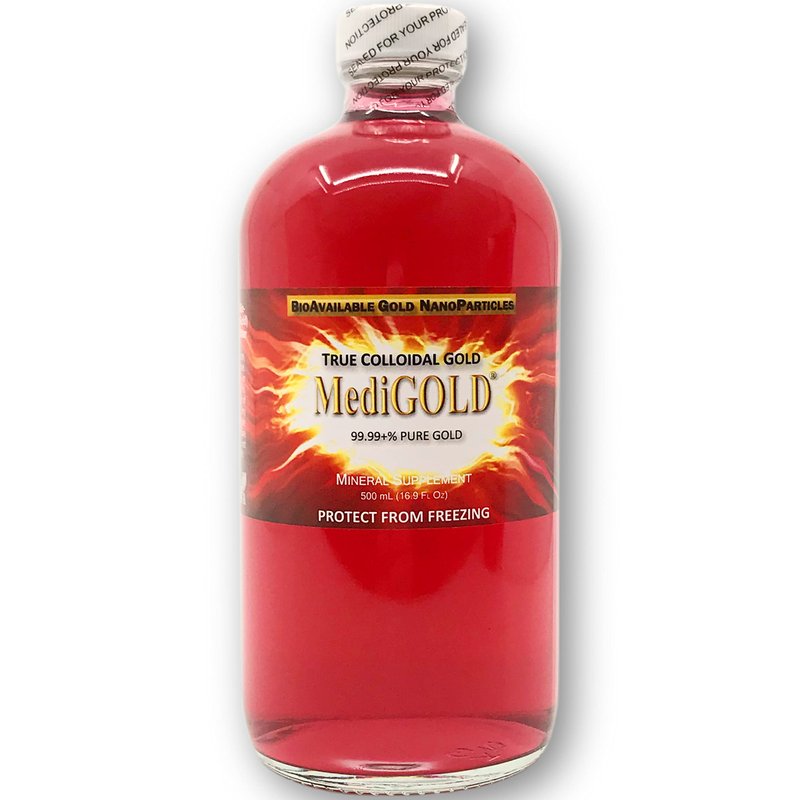 - You are purchasing 500 mL (16.9 Fl Oz) of MediGOLD True Colloidal Gold dietary supplement in a clear glass bottle