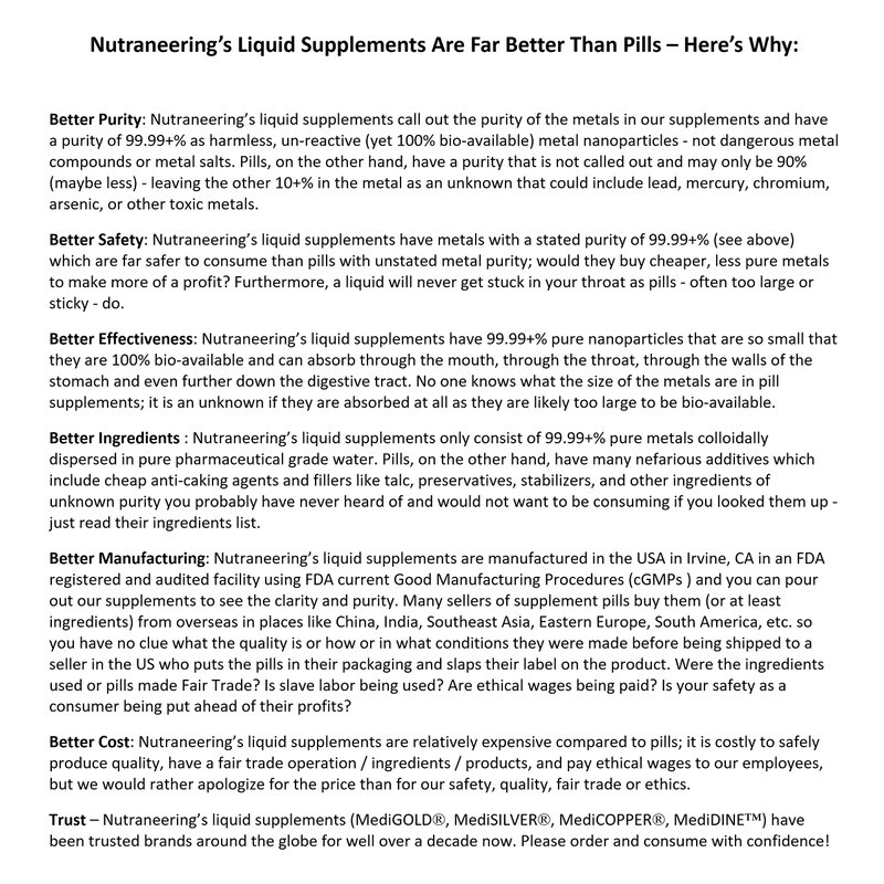 MediGOLD True Colloidal Gold dietary supplement has been a trusted brand of colloidal Gold dietary supplements across the globe for well over a decade now – so you can order and consume MediGOLD with confidence! It is made in the USA where it is manufactured, tested and bottled using current Good Manufacturing Practices (cGMPs) by Nutraneering in our facility in Irvine, California on Technology Drive – right next to some of the greatest biotech companies in the world. Production, documentation and quality control (QC) testing are overseen by our founder - Biochemist and former Research Scientist at NASA’s Water and Food Analytical Lab (W.A.F.A.L.) in building 37 (the Life Sciences Building) at the LBJ Space Center – Houston. MediGOLD consists of ultra-pure Gold nanoparticles colloidally suspended and dispersed in pharmaceutical grade pure water - that's it (0.00% chemicals). The Gold nanoparticles in MediGOLD are made from 99.99+% pure Gold - this is much purer than 24K Gold which is only 99.9% pure (max). Purity is critical as the impurities in 24K Gold (the .10+% %) can include Lead, Arsenic, Cyanide, Hexavalent Chromium, Mercury and more. MediGOLD is a red, odorless, tasteless liquid. MediGOLD's Gold nanoparticles have an average size of less than 3 nm in diameter - making them not only 100% bio-available, but the smallest Gold nanoparticles on the globe - so small they easily pass across the blood brain barrier where they can be used by the brain as well as by any organ or cell in the body. MediGOLD is safe to consume as a dietary mineral supplement; take as directed as taking more is not likely to yield any additional benefit. Nutraneering's liquid dietary supplements are significantly better than pills; please see attached image for proof. You can find more heavily advertised, even more expensive true colloidal Gold supplements, but we are confident that you will not find one better - at any price. Shipping to anywhere in the USA is free – including AK & HI.