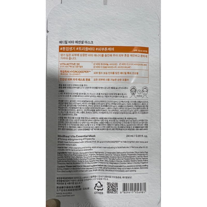 Mediheal Best Korean Sheet Mask - Vita Essential Face Mask 4 Sheets Vitamin Mask For All skin types Smoothing Tightening Toning up Brightening