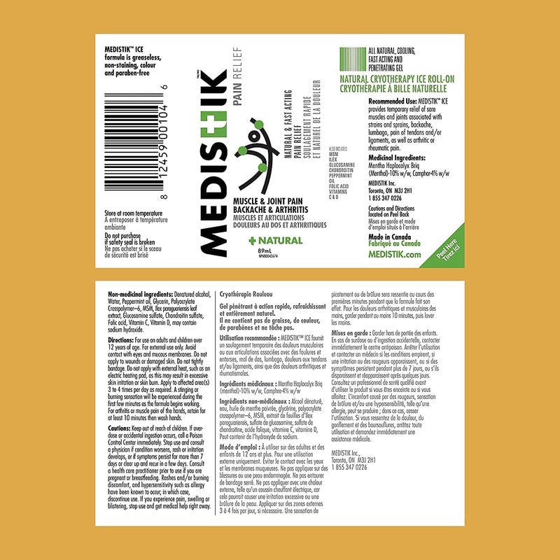 - ALL-NATURAL ROLL ON: Medistik Ice Roll On is an all natural, cooling penetrating gel. It penetrates the skin quickly providing rapid relief of muscle and joint aches and pains with natural anti-inflammatory action! natural anti-inflammatory action!