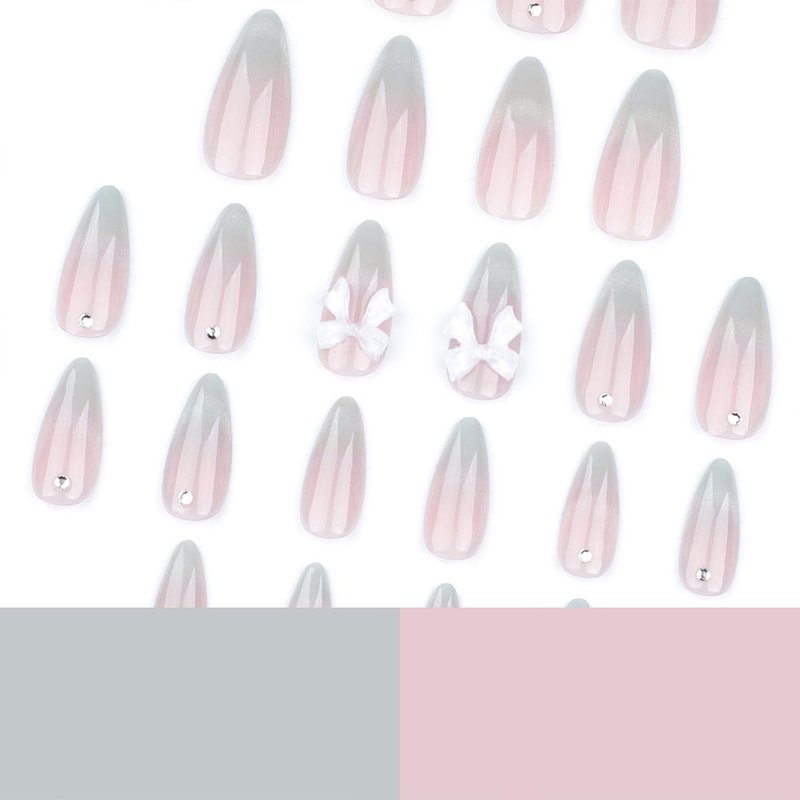 Medium Almond Press on Nails Cat Eyes French Tip Fake Nails Pink Gradient Acrylic Nails with Dot Diamond and 3D Bow Designs Artificial False Nails Glossy Full Cover Glue on Nails for Women 24Pcs