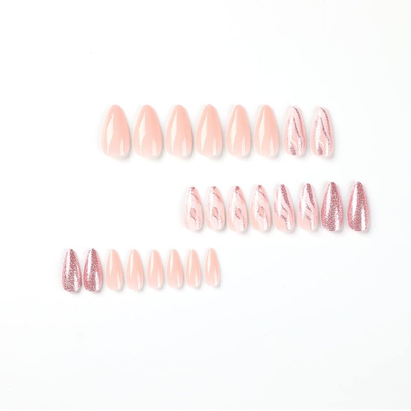 Medium Almond Tip Press on Nails Nails Artificial Acrylic Fake Nails with Pink Glitter Powder Designs, 24Pcs Full Cover Reusable Coffin False Nails Set Women Glue on Nails Stick on Nails for Nail Art